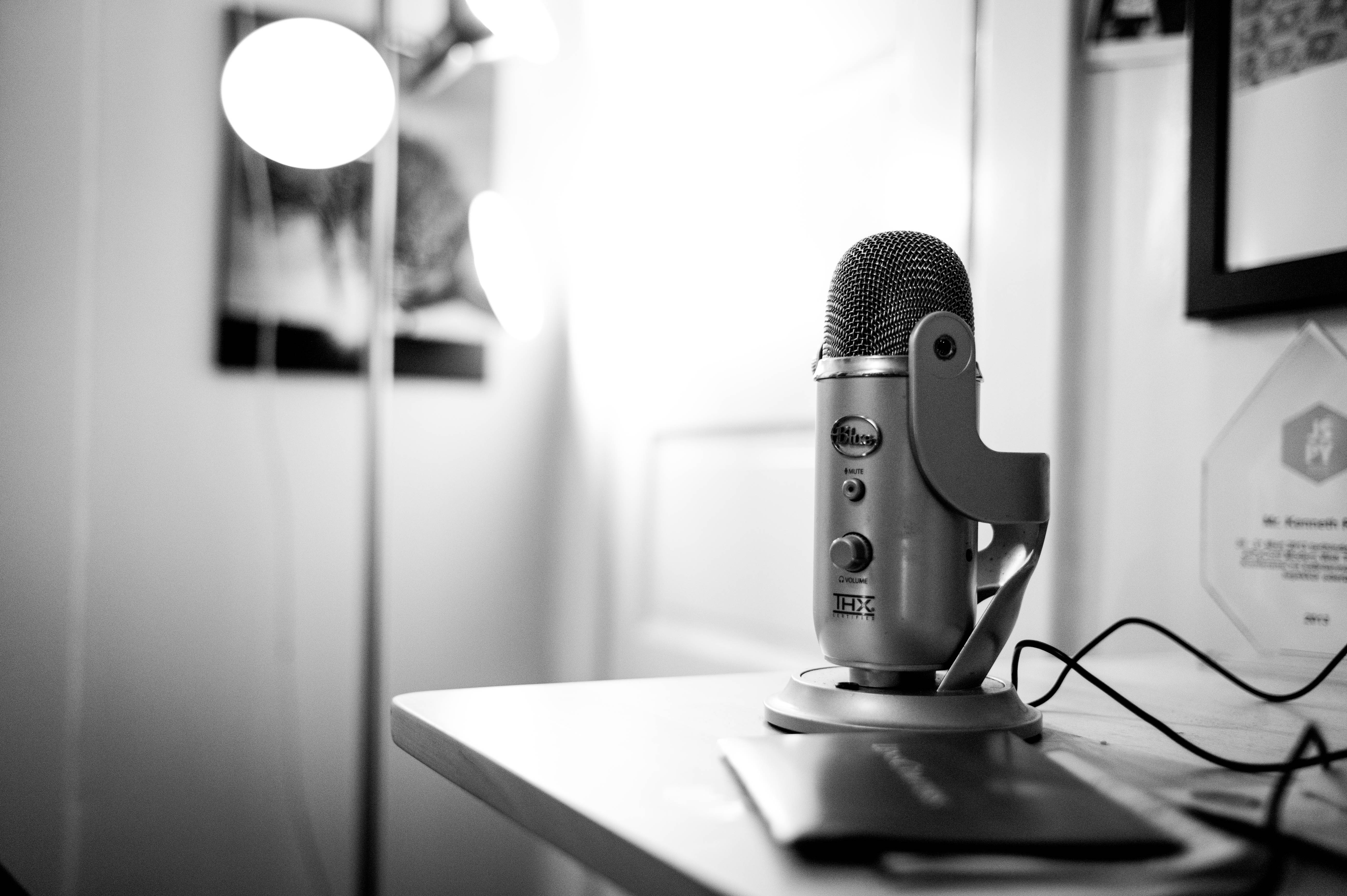 This stark black-and-white photograph features a microphone, elegantly positioned on a simple white desk, bathed in soft, ambient light. The contrasting shadows evoke a mood of introspection and creativity, while the surrounding elements, including a distant lamp and framed photographs, hint at an inviting yet focused workspace. The composition draws the eye toward the microphone, suggesting anticipation for the spoken words it awaits.