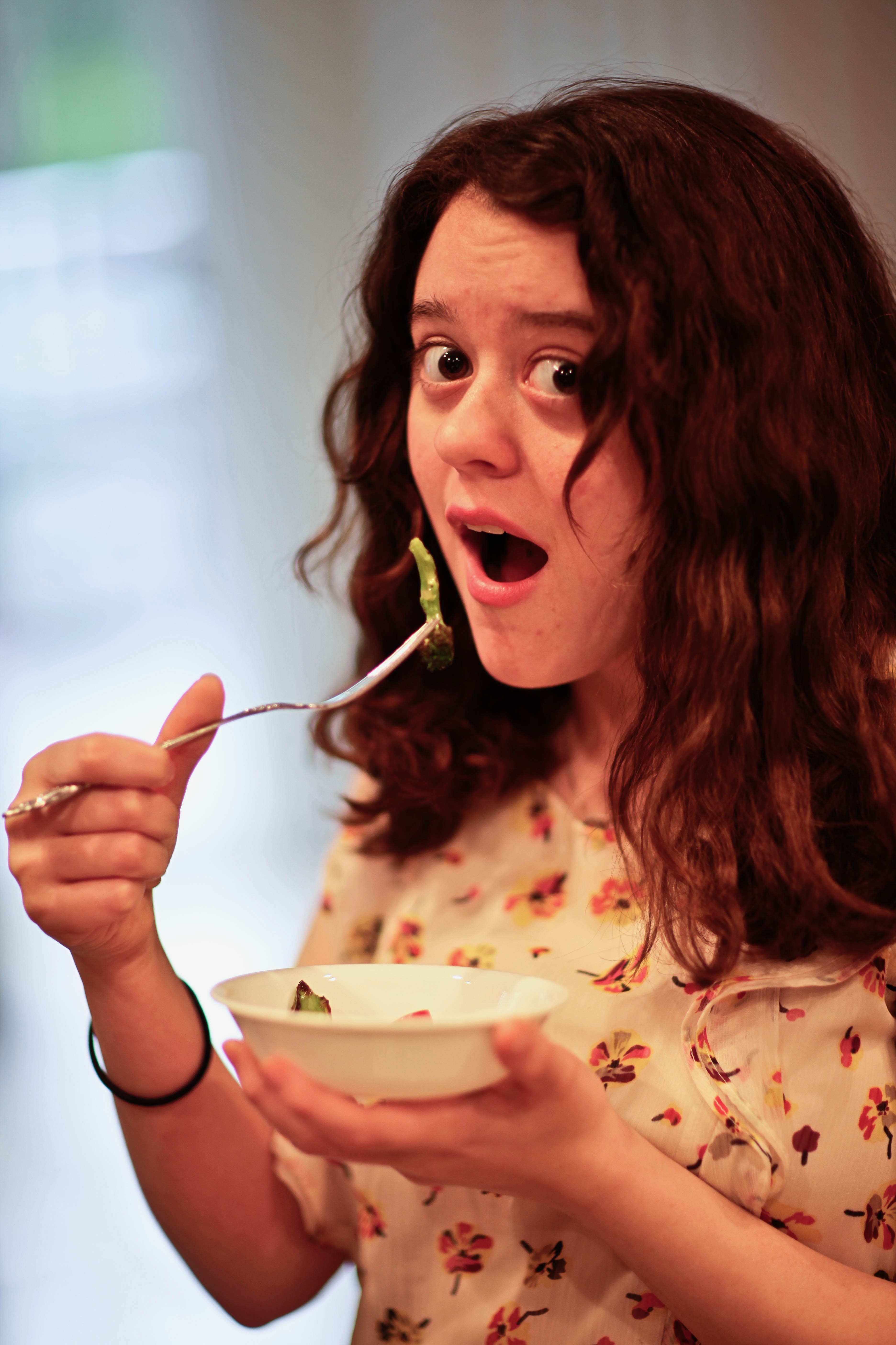 A girl with curly hair takes a bite from her bowl, her wide eyes and open mouth suggest a moment of unexpected flavor or surprise. The soft, diffused light enhances the intimacy of the scene, highlighting her light floral blouse and creating a warm, inviting atmosphere.