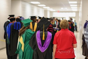 A group of graduates and faculty members fills a well-lit corridor, filled with vibrant robes and caps, signaling the excitement of a graduation ceremony. The warm atmosphere is accentuated by the soft glow of the overhead lights, creating a sense of unity and anticipation as everyone gathers for the momentous occasion. The shot focuses on the back of a woman in a red shirt, contrasting with the colorful academic regalia around her, highlighting the emotional significance of the event.