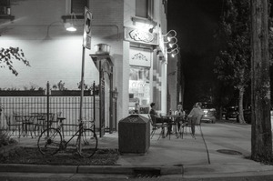 In this monochrome scene, a cozy café glows invitingly under warm lights, creating a contrasting backdrop against the dark night. Patrons seated outside engage in intimate conversation, their silhouettes softened by the café's warm glow, while a bicycle leans casually nearby, hinting at the simplicity of evening leisure. The composition captures a perfect blend of urban charm and the serenity of nighttime camaraderie.