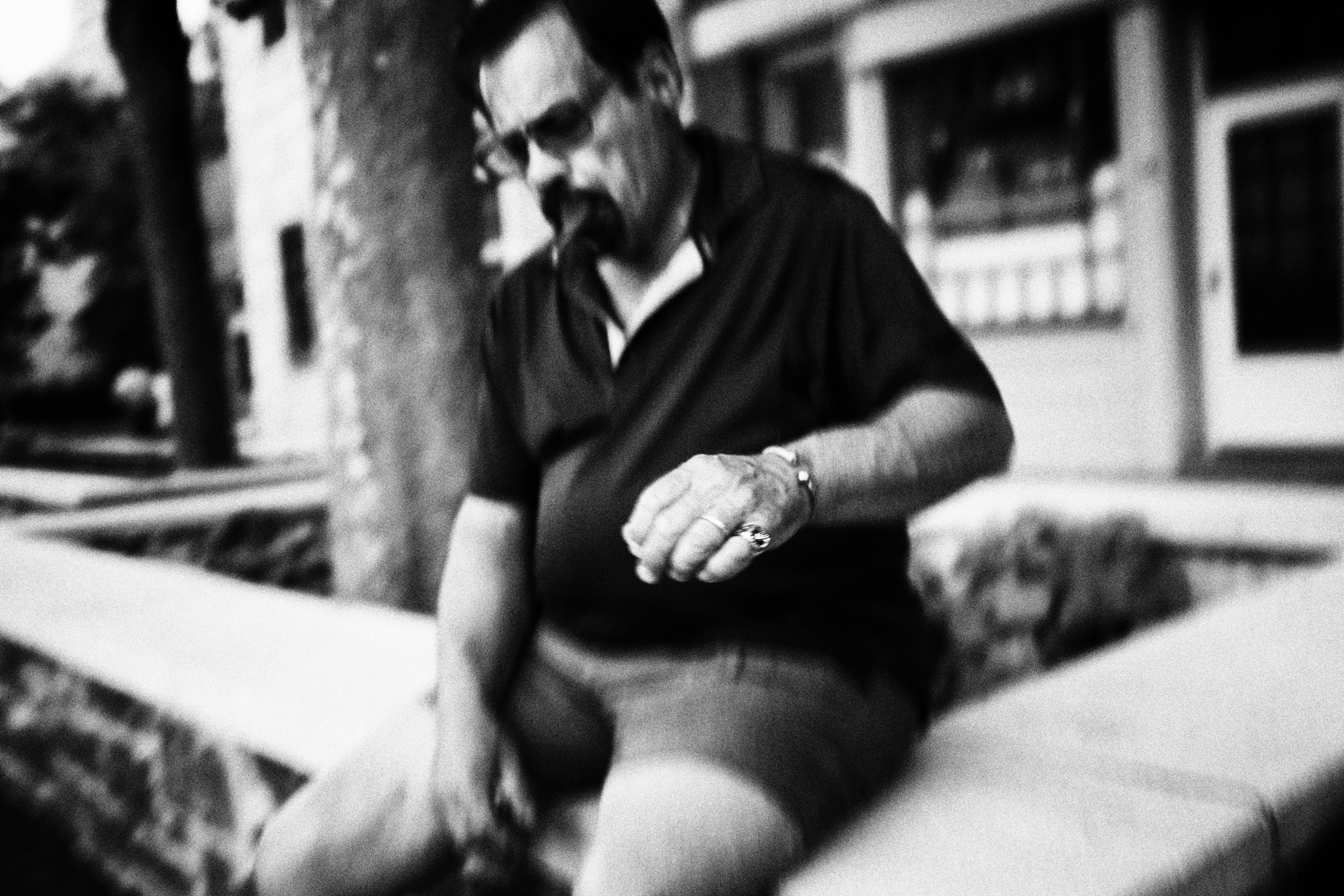 A man sits contemplatively on a stone bench, his gaze directed downwards as he inspects his watch. The photograph's blurred edges create a dreamy, nostalgic atmosphere, contrasting with the sharpness of the man's features. The monochromatic palette enhances the mood of introspection, inviting the viewer to ponder the significance of time.