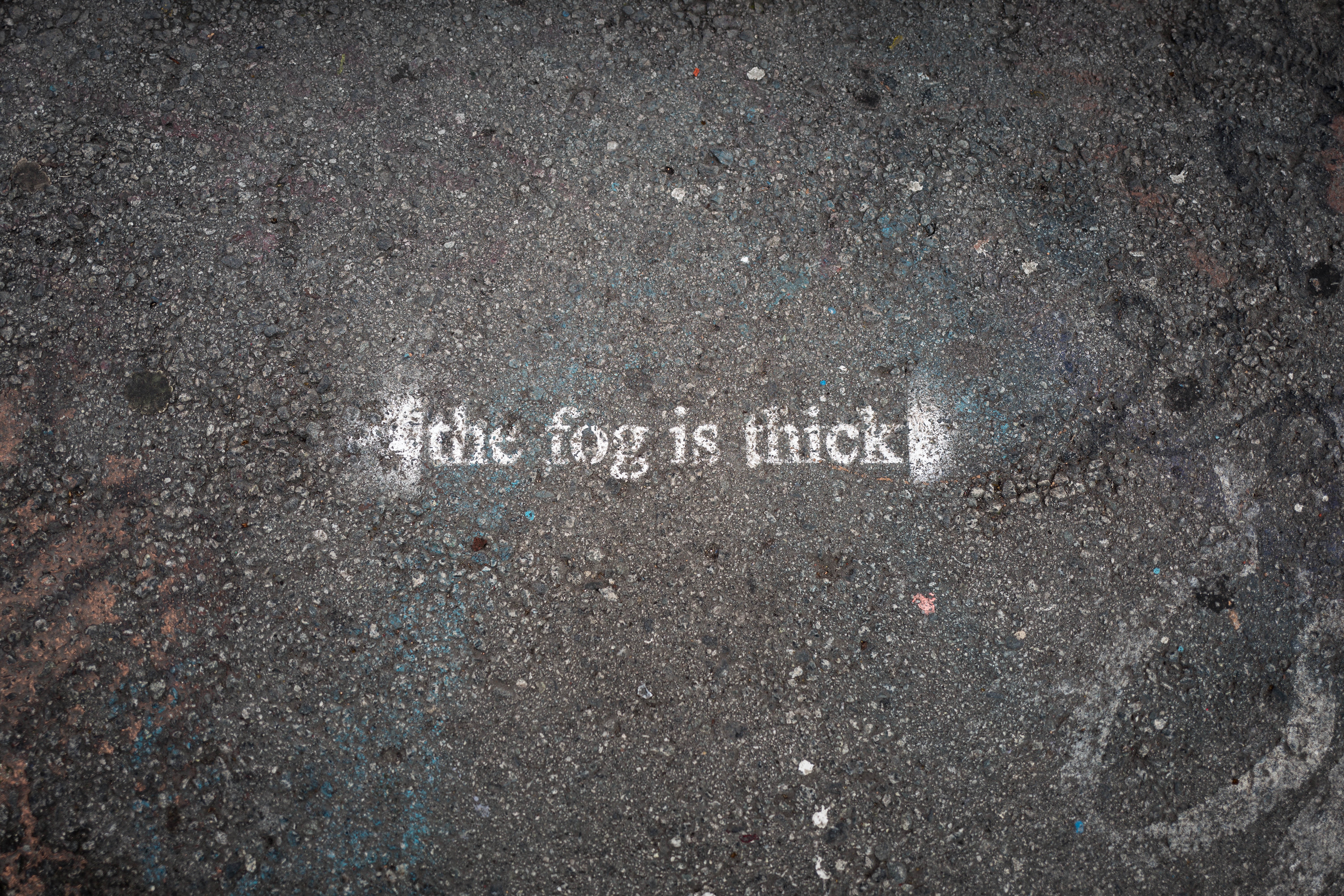 This photograph captures a stark message, 'the fog is thick,' spray-painted on a rugged asphalt surface. The muted colors and texture evoke a somber, contemplative mood, inviting introspection. Subtle play of light across the pavement highlights the contrast between the bold text and its gritty surroundings, emphasizing the isolation of the statement.