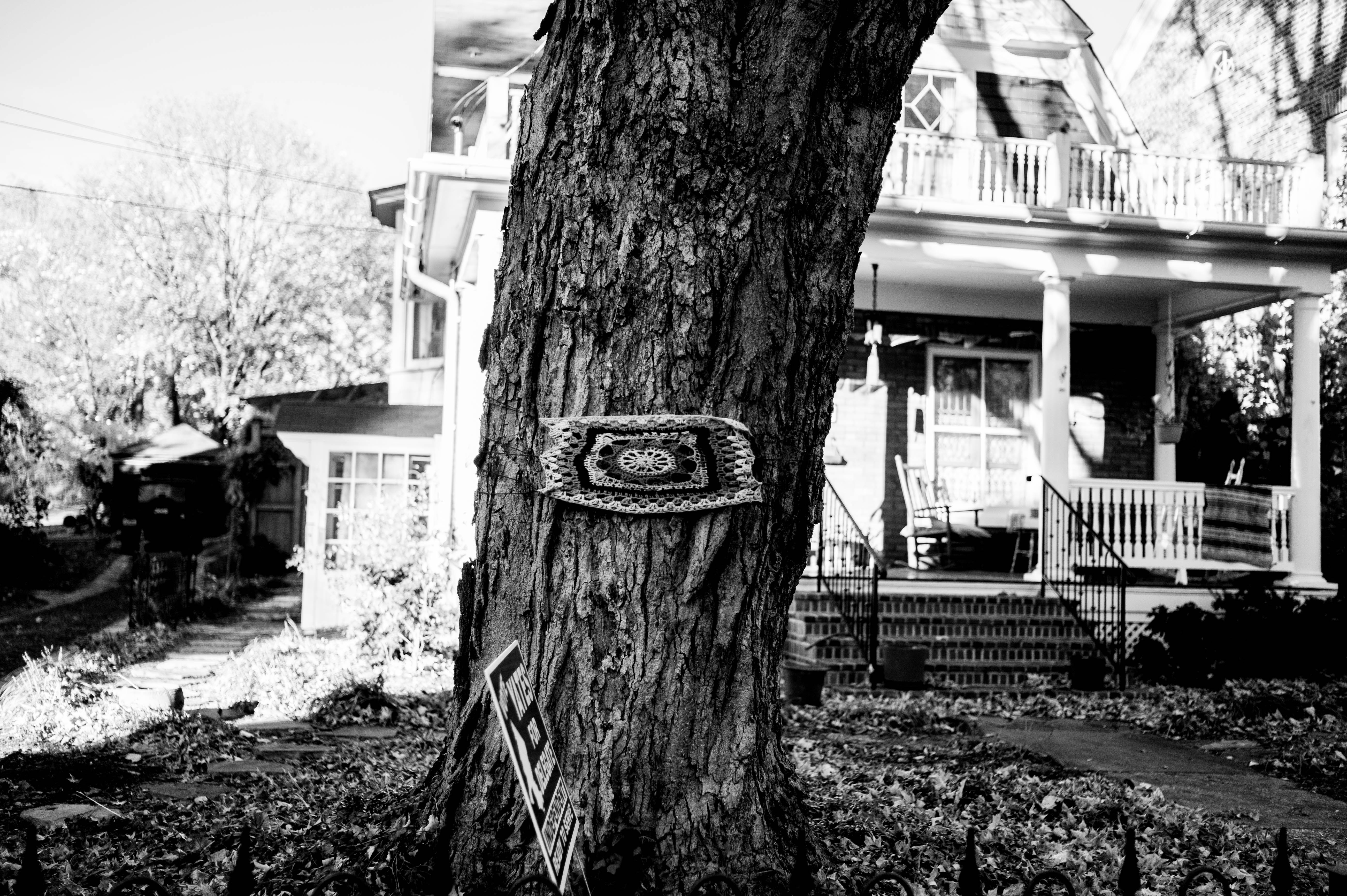 The photograph captures a textured tree trunk adorned with a woven tapestry, standing as a bold statement against a softly blurred background of an old house. Bathed in stark black and white, the lighting accentuates the details of the bark and the cozy architecture, evoking a sense of nostalgia and quiet warmth. The composition draws the eye to the intersection of nature and human creativity, suggesting a story waiting to be discovered.
