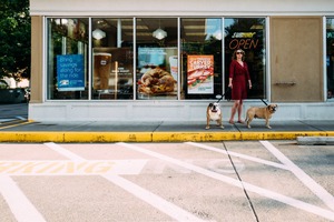 A woman stands confidently on the curb outside a busy deli, holding the leashes of her two dogs. The scene is vibrant with bright signage and warm sunlight, evoking a relaxed, everyday atmosphere. The composition draws the eye from the subject forward to the inviting open storefront, blending urban life with a sense of companionship.