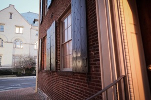 This photograph captures a quaint, historic brick building bathed in the warm glow of evening light. The juxtaposition of the weathered brick and metal shutters evokes a sense of nostalgia and quiet charm, while the soft light enhances the inviting mood. The framed windows and doorway lead the viewer's eye into a serene, almost secret world, hinting at stories past and present.