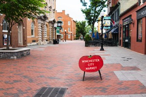 This photograph captures a serene moment in Winchester's city market, featuring a charming red sign announcing the market's presence. The warm, inviting brick pathway stretches into the distance, flanked by vibrant greenery and quaint storefronts, creating a sense of community. Soft daylight bathes the scene, enhancing the cozy, tranquil atmosphere of the deserted street.