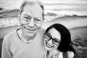 In this intimate black-and-white portrait, a smiling older man and a woman stand closely together against the backdrop of gentle ocean waves. The warm expressions on their faces contrast beautifully with the serene coastal setting, evoking a sense of love and shared joy. The soft lighting highlights their features, enhancing the emotional connection between them as they enjoy a moment by the sea.