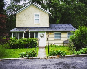 The photograph captures a charming little house nestled among lush greenery, evoking a sense of warmth and homeliness. Soft lighting filters through the foliage, highlighting the inviting front porch adorned with a seasonal wreath. The composition emphasizes the tranquil surroundings, making the house feel like a hidden gem in a peaceful neighborhood.