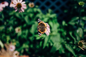 A vibrant butterfly hovers gracefully above a colorful flower, capturing a fleeting moment in nature. The soft focus on the surrounding blooms enhances the butterfly's striking patterns, evoking a sense of tranquility and whimsy. Bright, natural lighting highlights the intricate details of the butterfly's wings, adding to the photograph's enchanting mood.