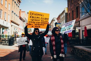 The photograph captures a lively march down a historic street, filled with passionate protesters holding signs advocating for gun safety. The bright yellow sign stands out amidst the muted tones of winter clothing, embodying the urgency and determination of the movement. The crisp, clear lighting adds a hopeful ambiance to the scene, highlighting the unity and resolve of the participants.