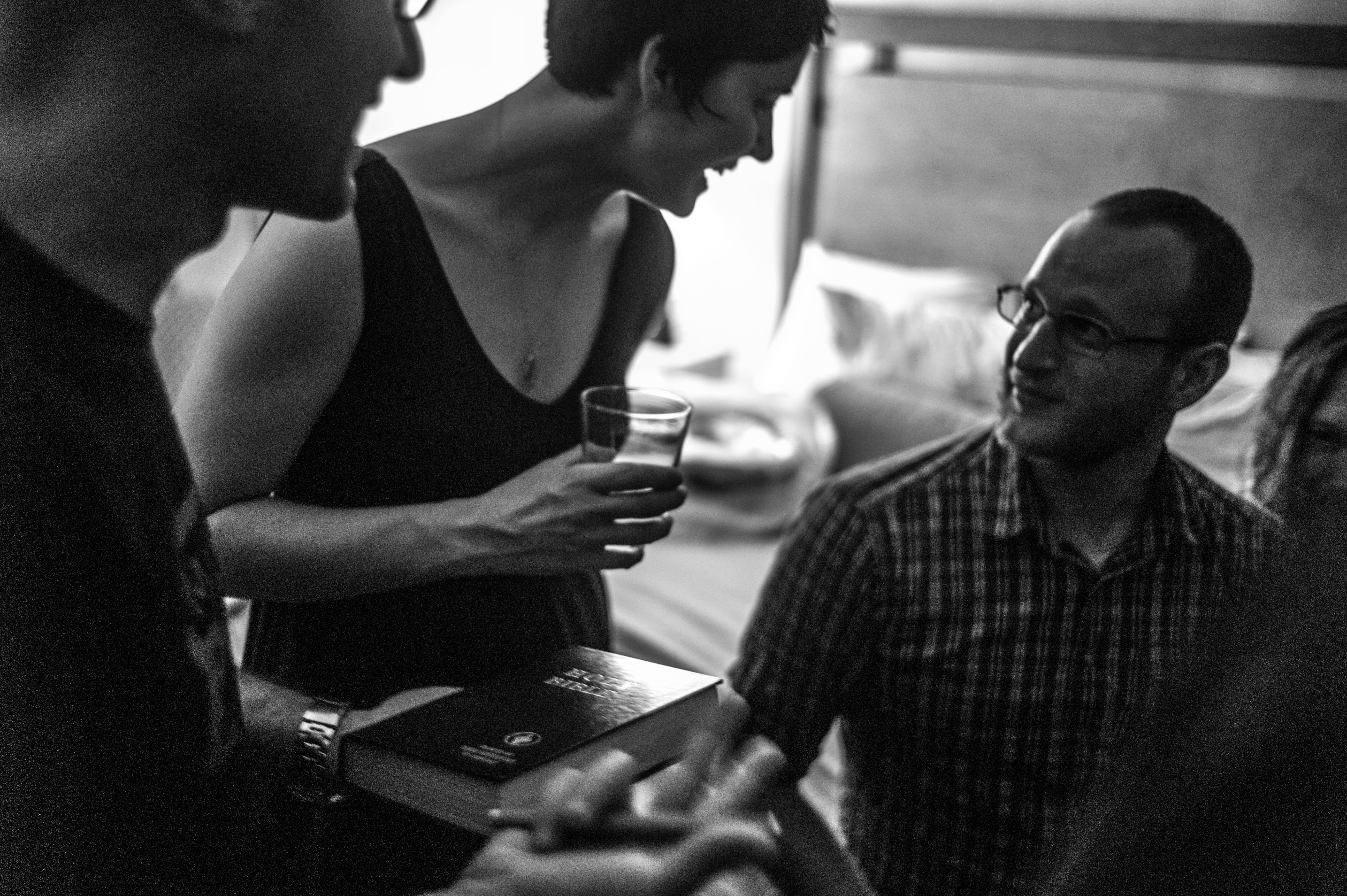 In a soft, dimly lit room, a lively conversation unfolds among friends, highlighted by the warm glow of a drink in the woman's hand. The intimate black-and-white composition captures the joy and camaraderie shared in the moment, as laughter and curiosity fill the air. The blurred figures in the foreground pull the viewer into the immediate, inviting atmosphere of connection and storytelling.