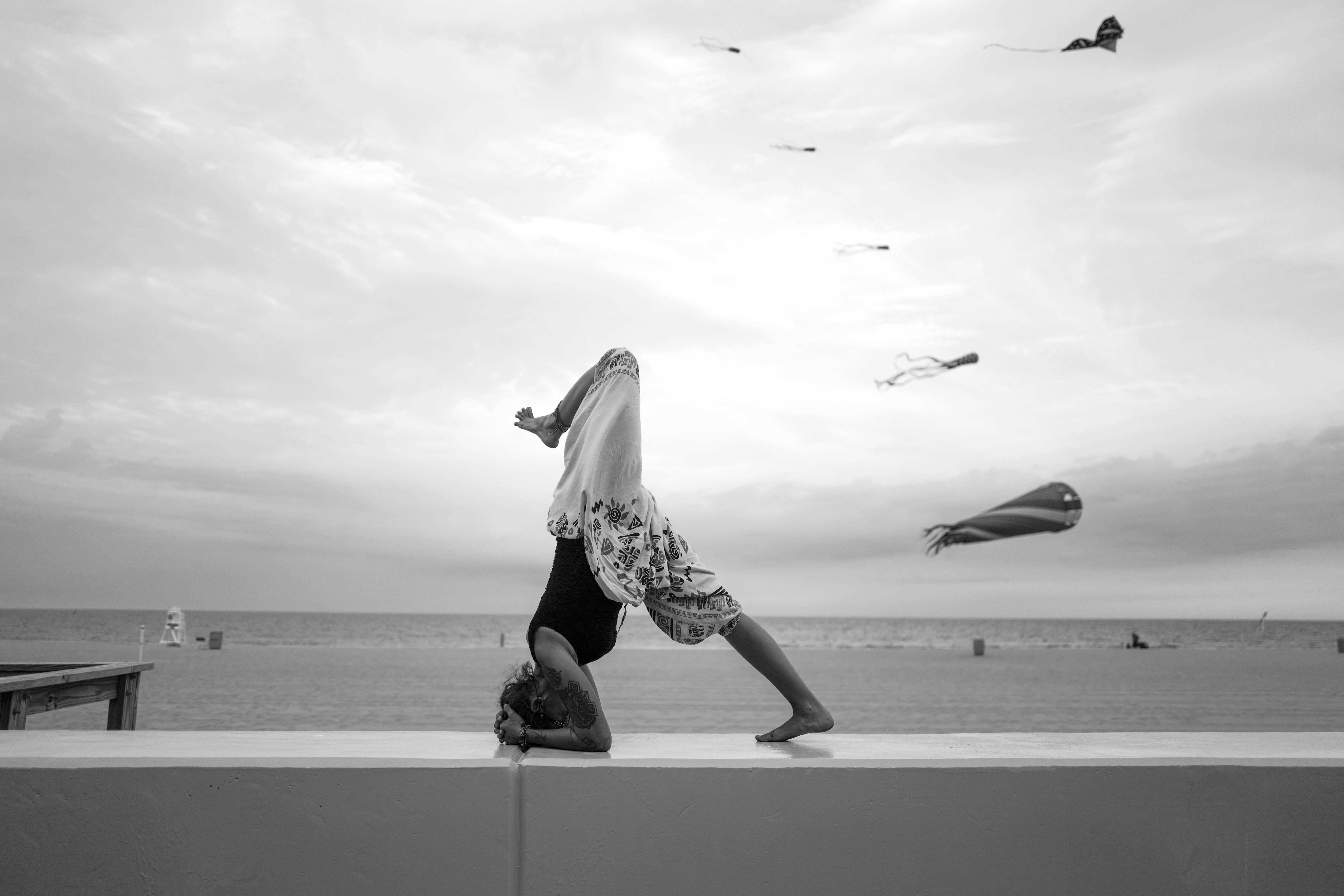 A young girl bends gracefully on the edge of a white wall, embodying freedom and playfulness against a vast beach backdrop. The dramatic black-and-white composition highlights her fluid movement, while kites dance in the sky, enhancing the sense of joy and lightness. The soft, diffused light casts gentle shadows, creating a serene yet dynamic atmosphere.