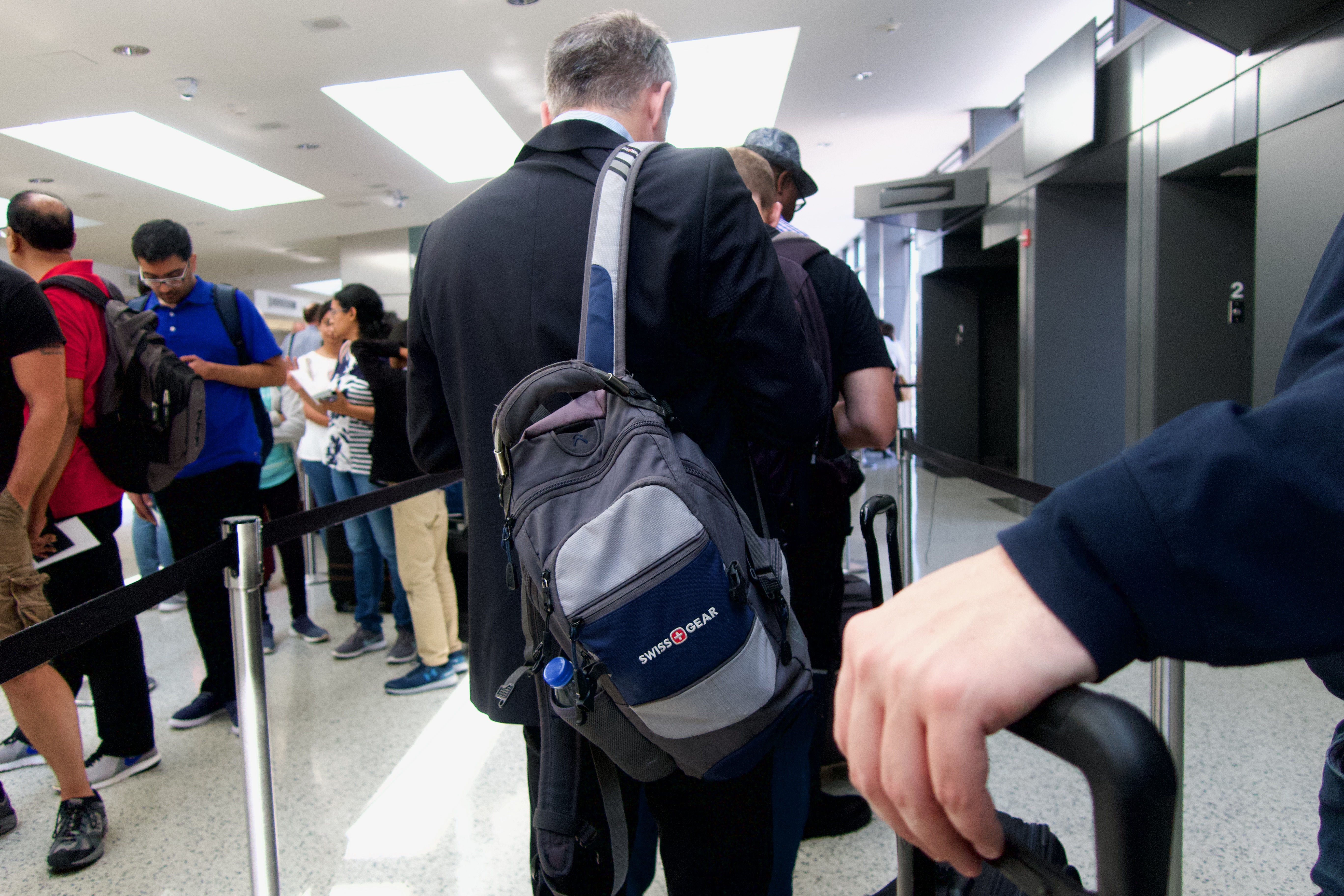 The photograph captures a diverse crowd waiting in line at an airport check-in, emphasizing a shared moment of anticipation and impatience. The lighting is bright and modern, creating a clean and open atmosphere, while the varied attire reflects the global nature of travel. The focus on the individuals' backs adds a sense of anonymity and collective experience among travelers.