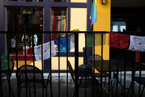 This photograph captures a vibrant scene framed by a dark railing adorned with colorful prayer flags that flutter gently in the breeze. The warm yellow wall and showcases behind create a sense of inviting warmth, contrasting with the muted black chairs that suggest a moment of quiet reflection. The soft lighting enhances the richness of the hues, evoking a peaceful yet lively atmosphere in the heart of a bustling environment.