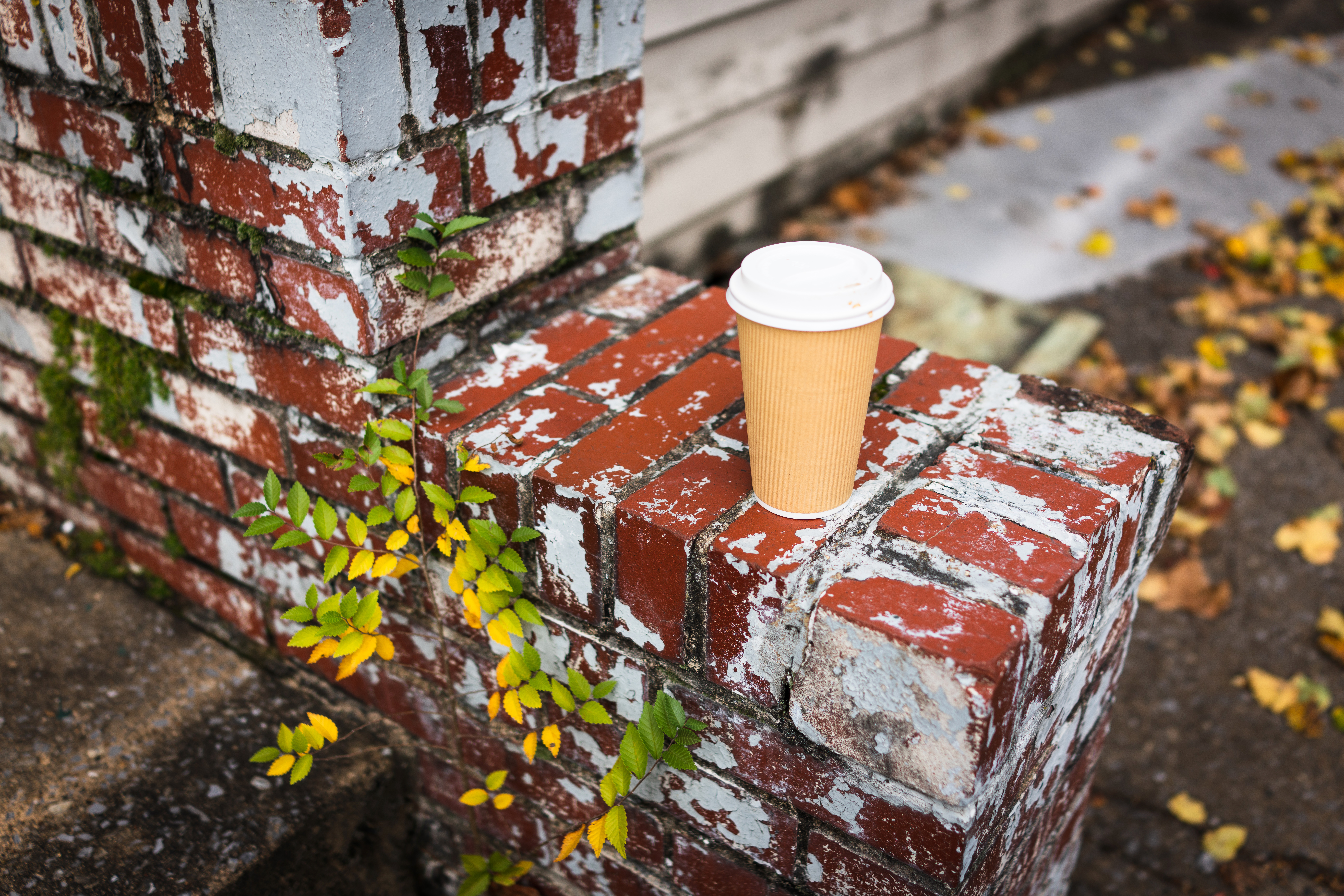 This photograph captures a solitary coffee cup resting on a rustic, weathered brick ledge adorned with vibrant green and yellow leaves. The composition conveys a sense of calm and introspection, with soft, diffused lighting highlighting the textures of the bricks and the natural elements creeping in. The juxtaposition of the urban environment and the simplicity of a coffee moment evokes a peaceful yet transient mood.