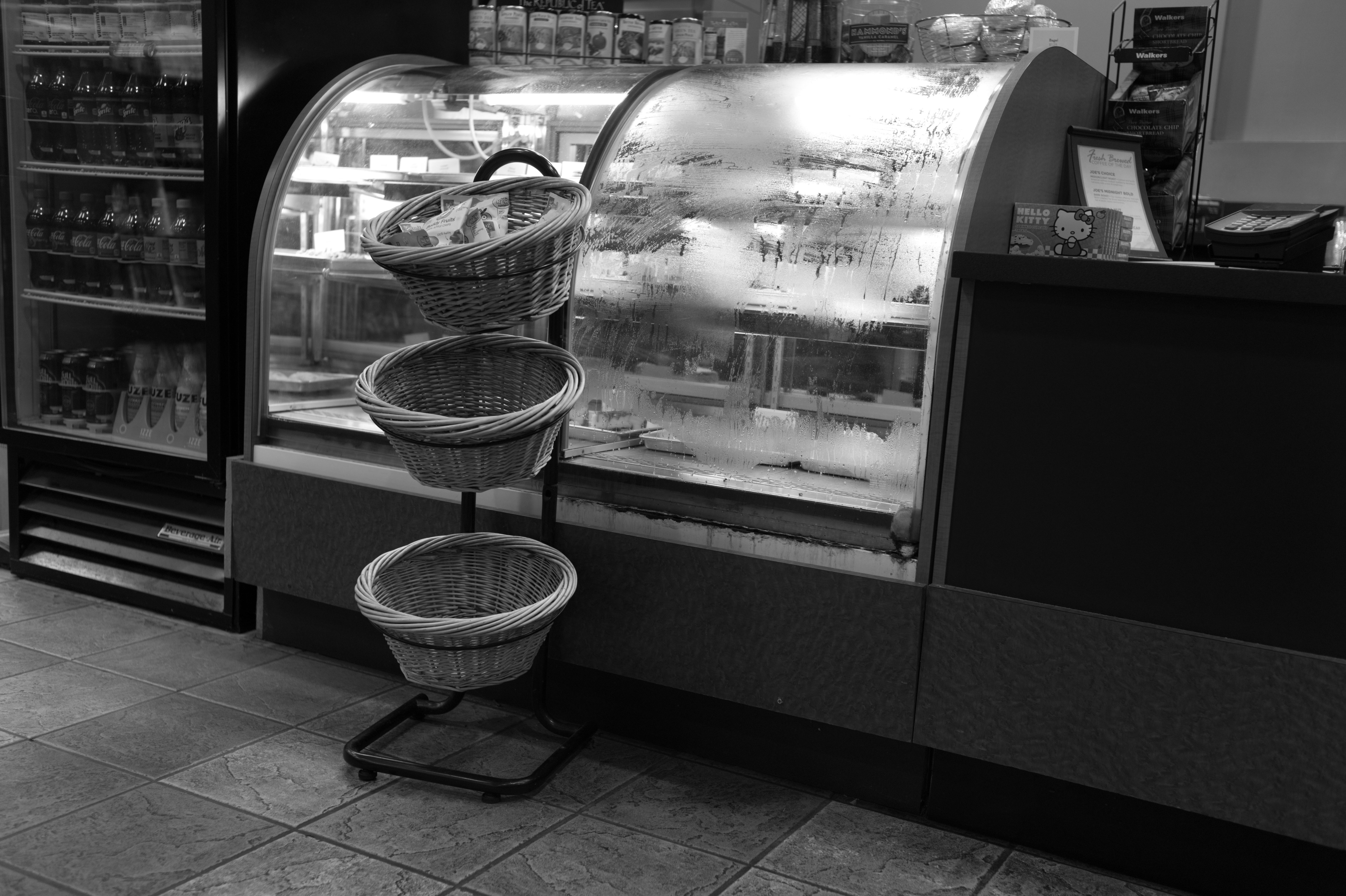 This black-and-white photograph captures a quiet corner of a café, featuring a condensation-covered display case alongside woven baskets perched on a stand. The soft, diffused lighting highlights the texture of the glass and the baskets, creating a nostalgic mood. The overall composition, with its emphasis on the interplay of shapes and shadows, evokes a sense of calm and stillness in an ordinary setting.
