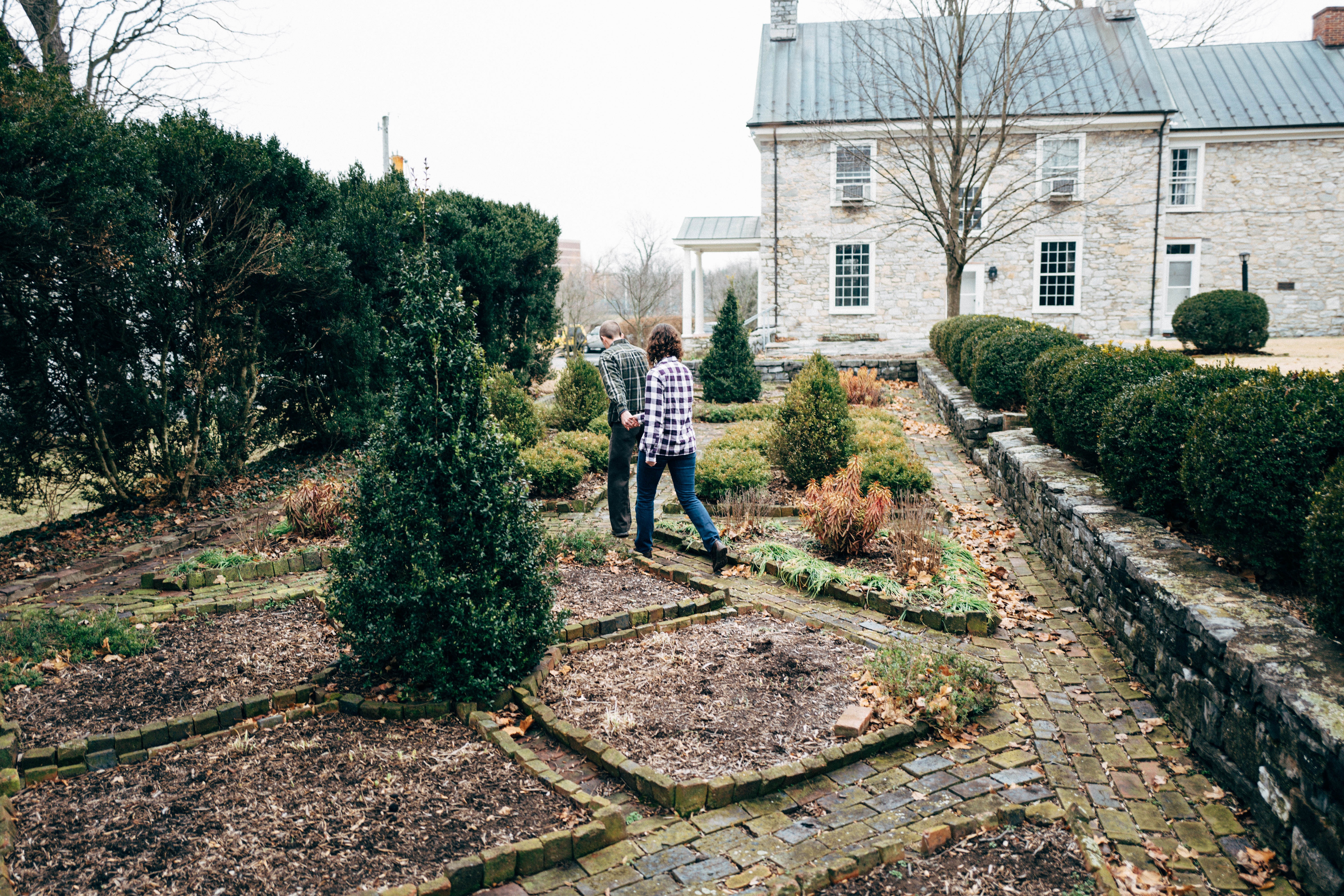In this serene photograph, two individuals stroll through a carefully landscaped garden, embraced by muted tones and a soft, overcast sky. The composition leads the eye along the winding path, bordered by neatly trimmed hedges and stone walls, evoking a sense of calm and connection with nature. The subdued lighting enhances the tranquil mood, inviting contemplation and reflection amidst the verdant surroundings.