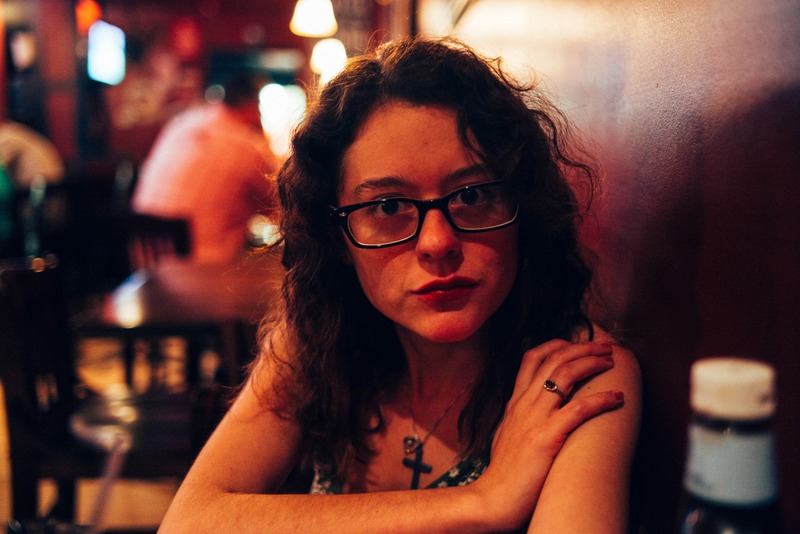 In a warmly lit café, a young woman gazes directly into the camera, her expression both contemplative and enigmatic. Soft shadows play across her face, highlighting her curly hair and bold red lips, while the blurred background creates a sense of intimacy amid the lively atmosphere. The composition draws the viewer in, inviting a connection with her thoughtful demeanor.