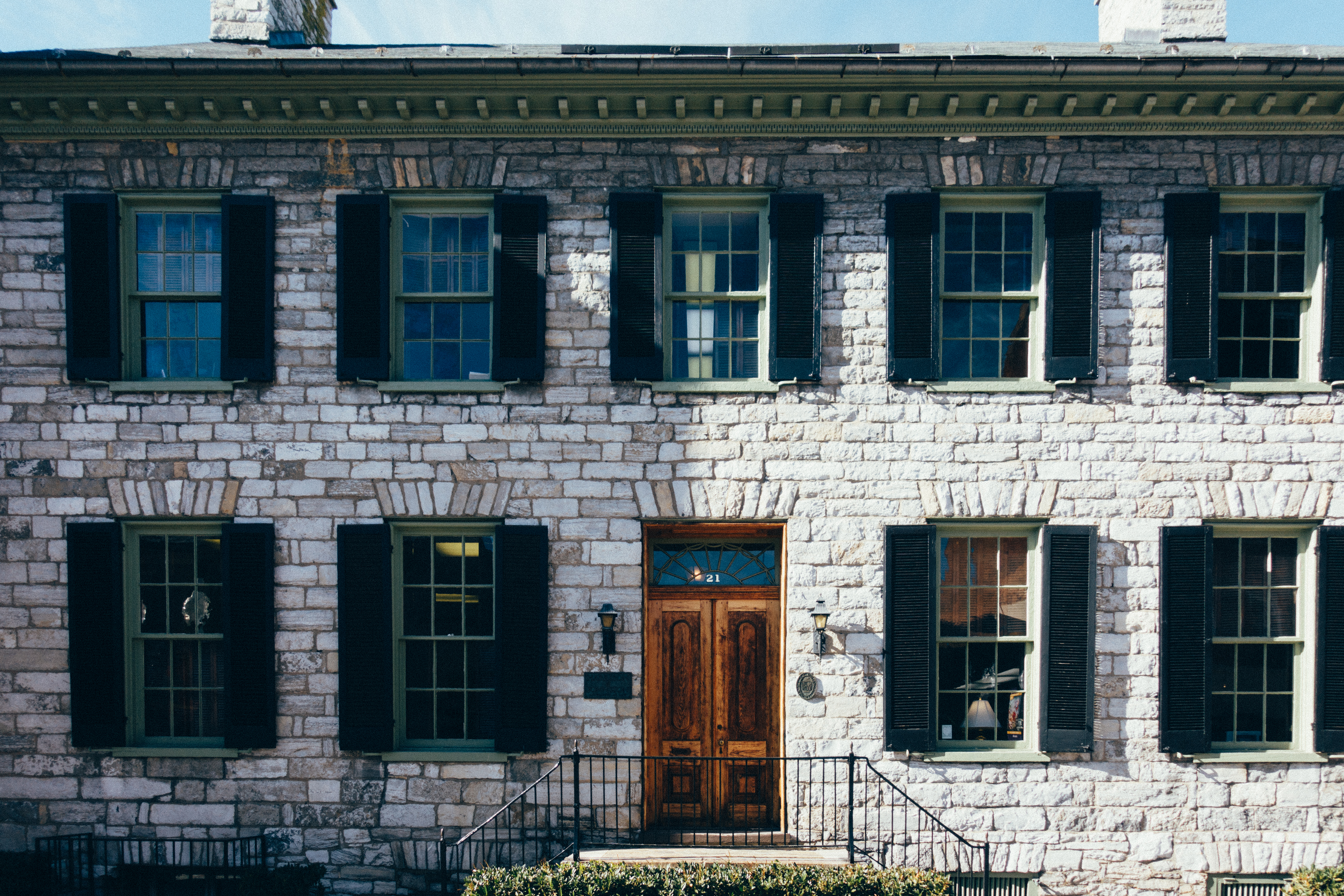 This photograph captures a stately stone house characterized by its rough texture and symmetrical windows. The wooden door, warmly inviting amidst the cool stone, creates a striking focal point, while the sunlight bathes the facade in a soft glow, enhancing the architectural details. A sense of timelessness and calm pervades the composition, suggesting stories waiting to be uncovered within its walls.
