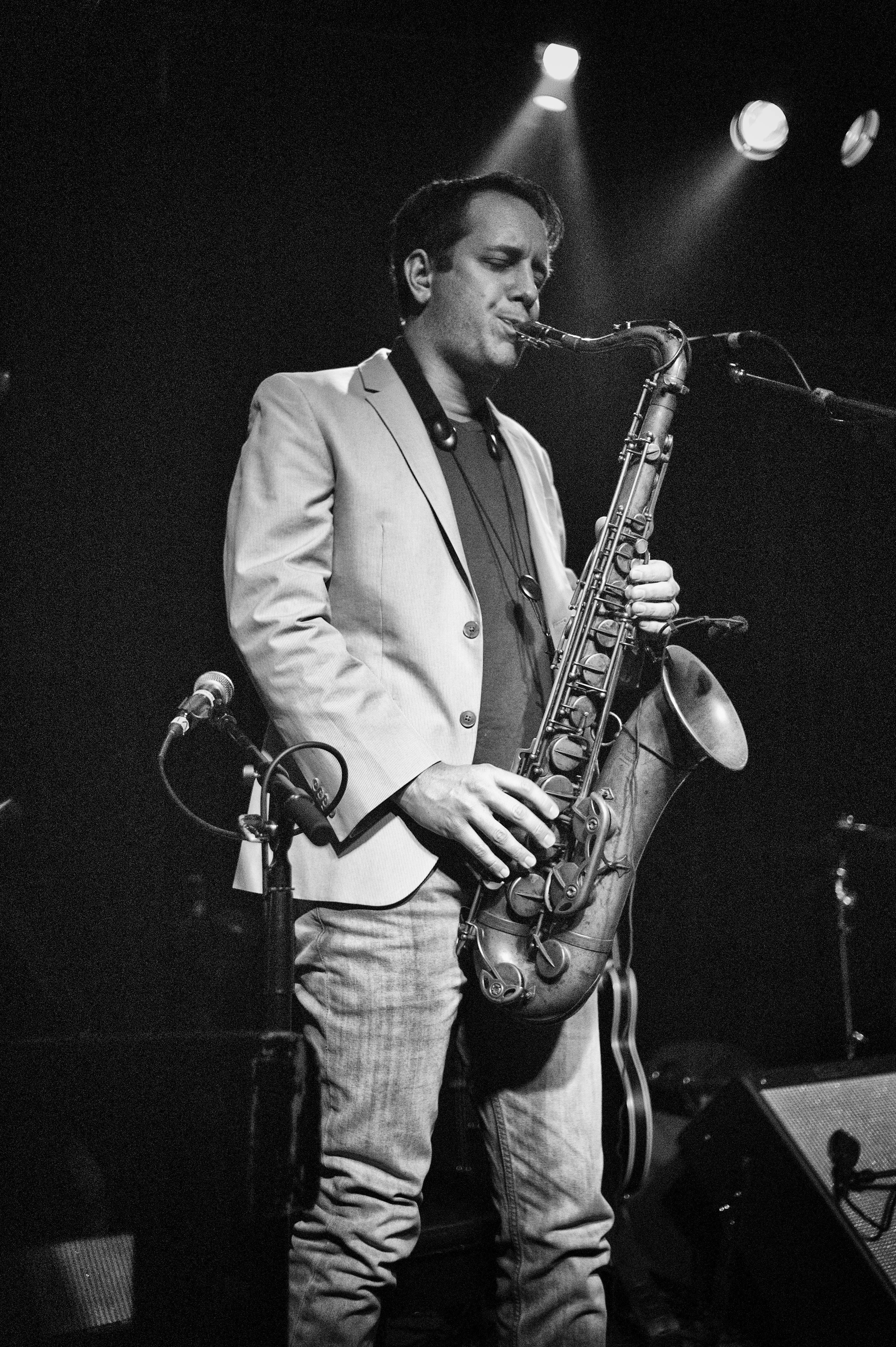 A saxophonist stands at the center of the stage, his focused expression revealing deep immersion in the music. The dimly lit venue, enhanced by stark lighting above, adds a dramatic flair that complements the intimate atmosphere. Clad in a light blazer and jeans, he embodies a blend of elegance and casual ease, drawing viewers in as he passionately plays his instrument.