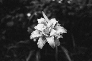 A delicate flower stands in stark contrast to a blurred, dark background, creating a striking focus on its intricate petals. The black and white composition enhances the texture and form, evoking a sense of timeless beauty and introspection. Soft lighting highlights the flower's contours, adding an ethereal quality to the scene.