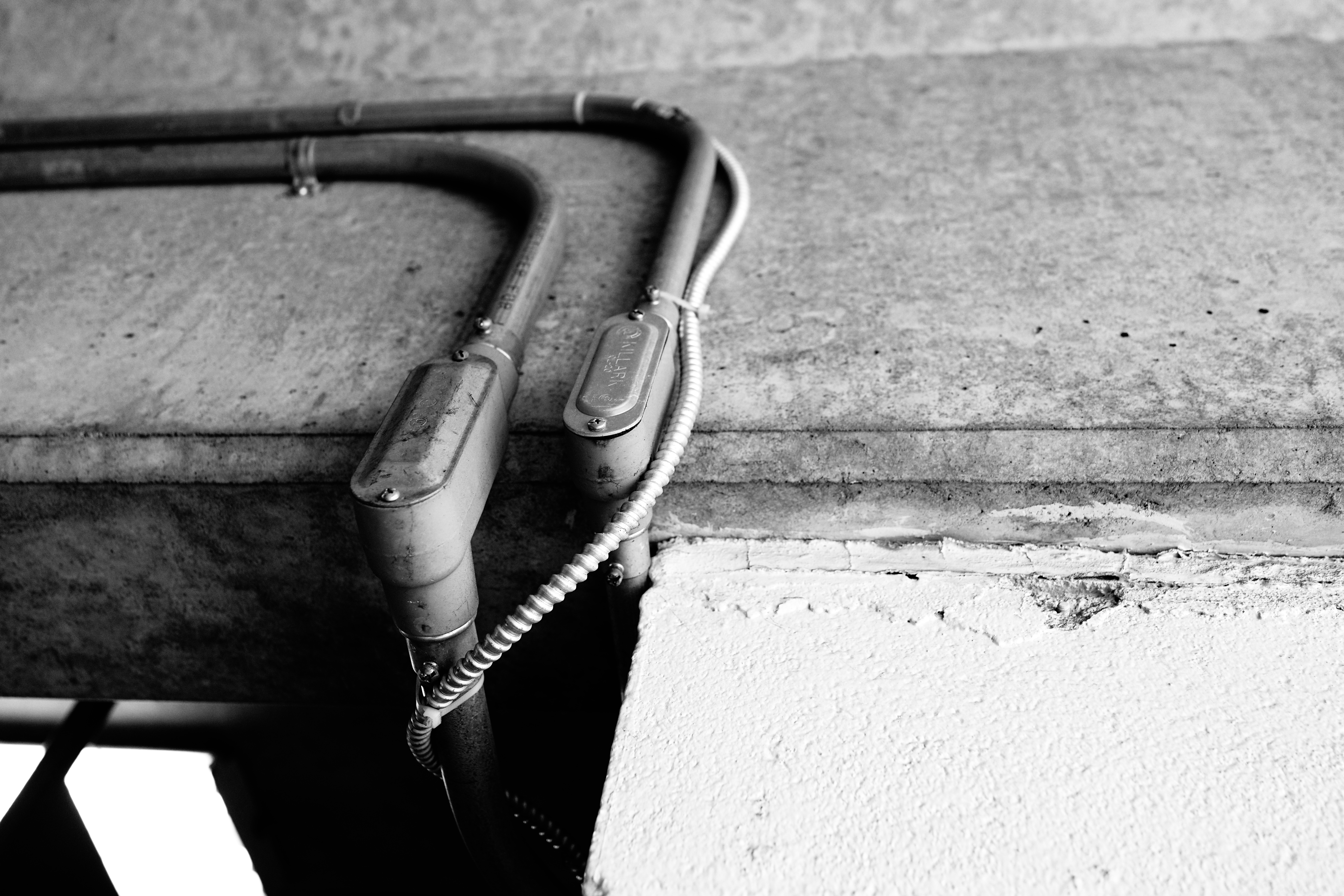 This close-up monochrome photograph captures the interplay of light and shadow on metal conduits and a concrete surface, evoking an industrial ambiance. The curved lines of the pipes contrast sharply with the angular edges of the wall, creating a sense of tension and dynamism. The subdued color palette enhances the mood of stillness and contemplation, inviting viewers to reflect on the beauty within utilitarian objects.