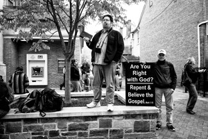In a black and white setting, a man stands confidently on a low wall, clutching a book and passionately addressing the crowd around him. The mood is one of urgency and contemplation, with onlookers displaying a mix of curiosity and indifference, while the soft natural light filters through the branches of a nearby tree, casting subtle shadows. A striking sign, prominently displayed, adds a layer of tension to the scene, inviting reflection on faith and belief amidst a busy urban backdrop.