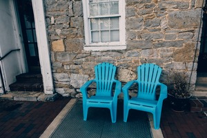 This photograph captures two bright blue adirondack chairs against a textured stone wall, creating an inviting yet serene atmosphere. The muted lighting suggests a calm day, enhancing the nostalgic charm of the setting. The composition draws the eye to the contrast between the cheerful chairs and the rustic backdrop, speaking to moments of relaxation and companionship.