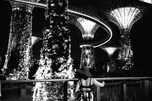 In this evocative black-and-white photograph, a figure stands contemplatively at a railing, gazing up at the towering, illuminated structures of the Gardens by the Bay. The scene is bathed in dramatic lighting, which contrasts the dark surroundings and highlights the elegant curves of the architecture. The mood is one of wonder and tranquility, inviting viewers to appreciate the blend of nature and modernity against the night sky.