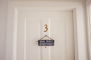The photograph captures a bright white door adorned with a charming sign that reads 'Home Sweet Apartment,' suggesting warmth and familiarity. Soft, natural light enhances the inviting mood, creating an atmosphere of tranquility and comfort. The simplicity of the composition draws attention to the bold number '3,' marking a personal and cozy space.