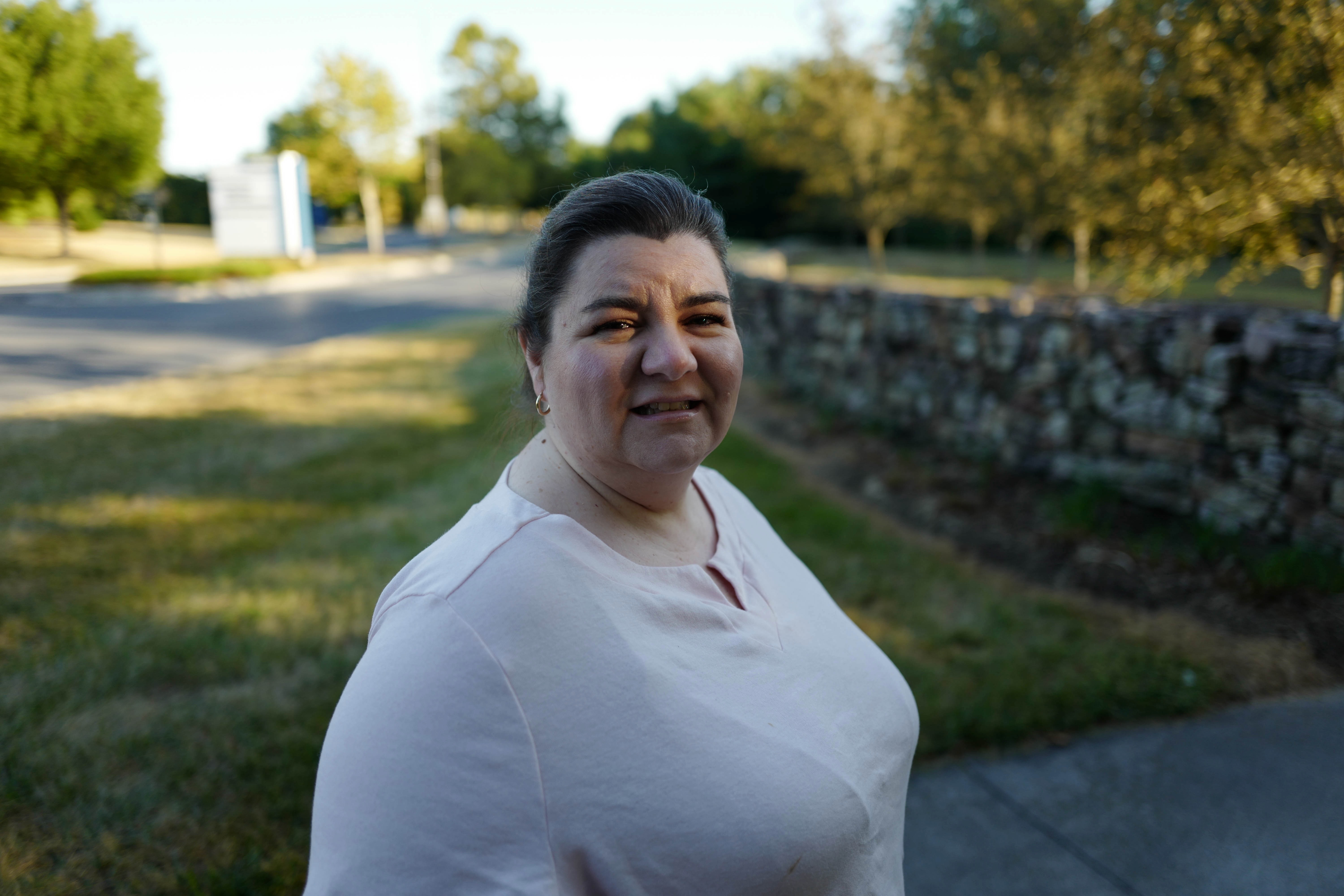 A woman stands at the forefront of a softly lit outdoor scene, exuding a sense of calm and contentment. The warm hues of the late afternoon sunlight illuminate her features, creating gentle contrasts with the blurred greenery and stone wall in the background. The composition draws the eye to her friendly expression, inviting connection amidst a serene backdrop.