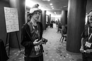 In a bustling conference hallway, a young man stands animatedly, clutching a camera while donning a whimsical hat. The monochromatic tones lend a nostalgic mood, contrasting with the lively backdrop of engaged attendees. Soft lighting from overhead creates a warm atmosphere, inviting connection and curiosity in the scene.