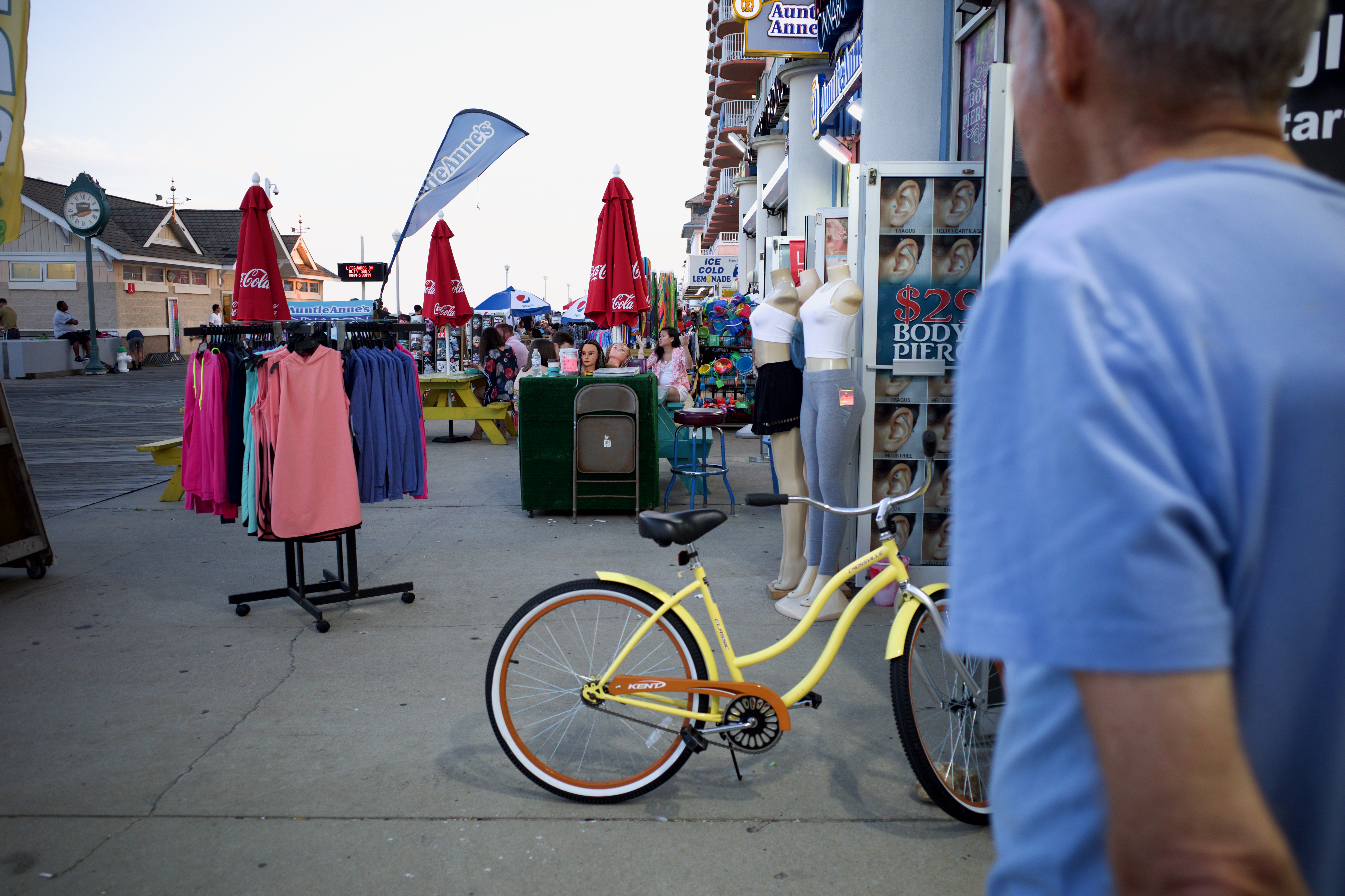 In this vibrant seaside scene, a vintage yellow bicycle stands out against the backdrop of colorful clothing racks and bustling shops. The fading light of dusk casts a warm glow, enhancing the nostalgic mood as an elderly man pauses to observe the lively atmosphere. The composition balances leisure with activity, inviting viewers to reminisce about carefree summer nights by the shore.