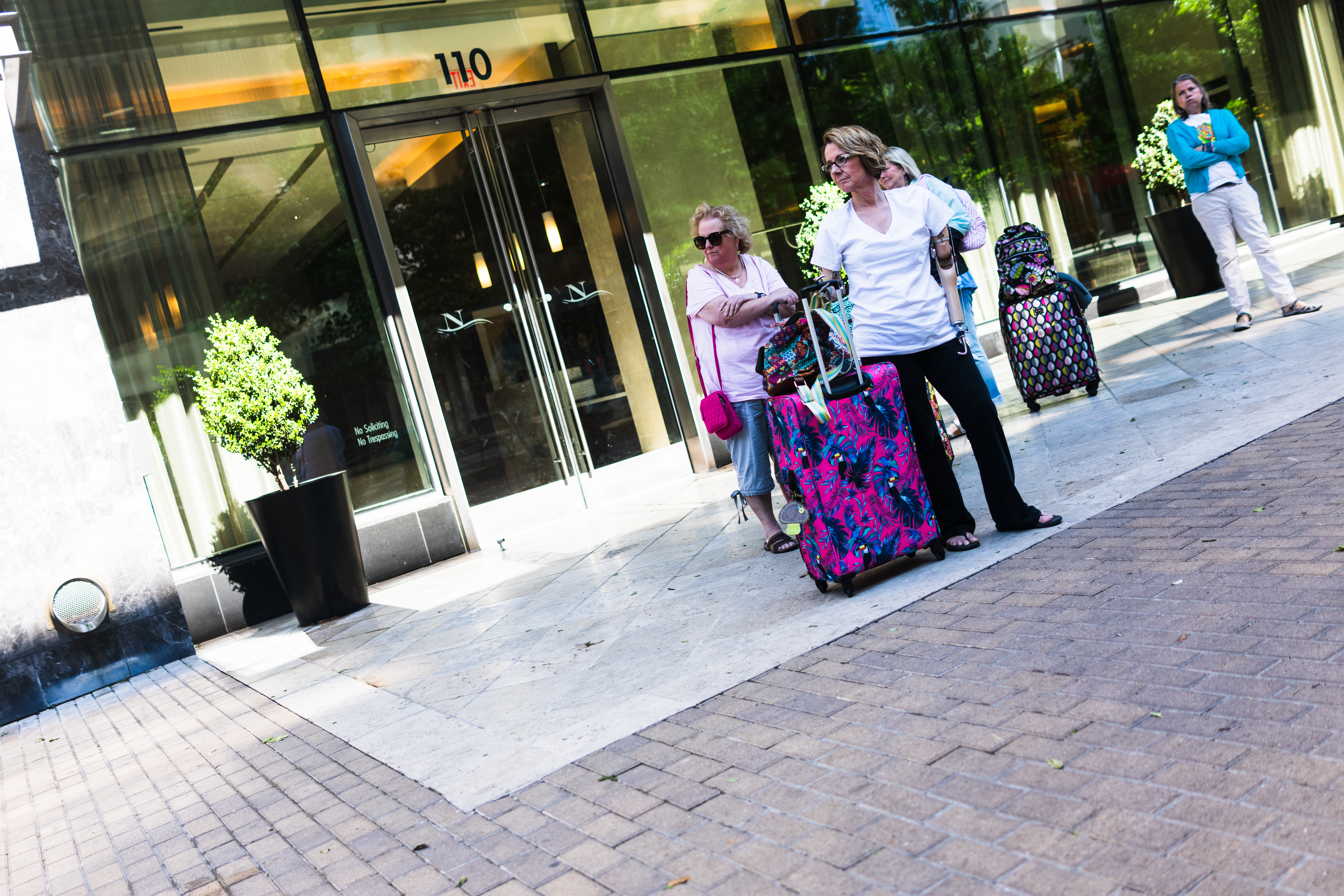 Three women stand outside a hotel, surrounded by vibrant luggage that contrasts with the muted tones of the building. The mood is one of impatience and anticipation, heightened by the bright sunlight casting sharp shadows on the pavement. The composition captures a moment of urban life, where travel and social connections converge.