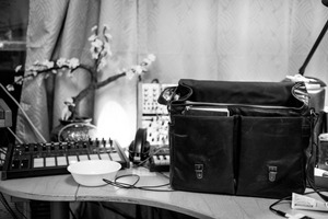 This monochromatic photograph captures a cluttered desk filled with musical instruments and a leather bag, symbolizing the harmonious chaos of creativity. Soft lighting illuminates the space, enhancing the intimate and focused atmosphere, while the contrasting dark objects draw the eye towards the central bag, suggesting readiness for inspiration. The blend of organic elements, like the blooming branch, adds a touch of calm amidst the creative bustle.