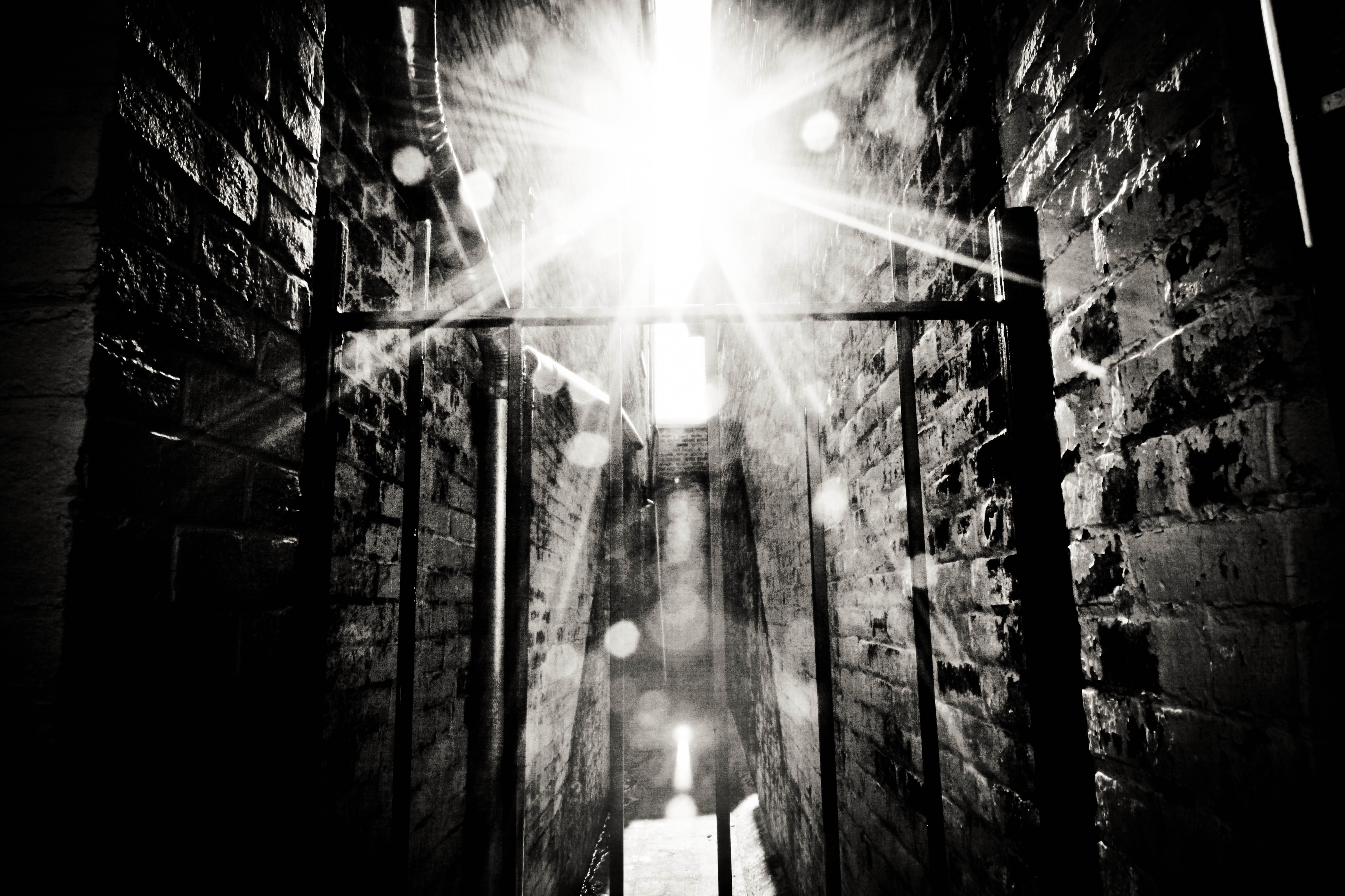 In this striking monochrome photograph, a narrow corridor emerges from shadows, illuminated dramatically by a burst of bright light at the end. The stark contrast between the textured brick walls and the radiant glow creates an atmosphere of both isolation and hope. The rays of light, enhanced by a soft blur, invite the viewer to contemplate the juxtaposition of confinement and liberation.
