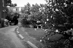 This serene black-and-white photograph captures a winding gravel path bordered by lush flowering bushes, leading towards a distant house. The composition creates a gentle sense of nostalgia and tranquility, evoking feelings of peaceful solitude. Soft lighting enhances the intricate details of the blossoms and the textures of the gravel, inviting the viewer to stroll along the path.