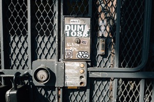 The photograph captures an old, weathered intercom system set against a gritty metal gate adorned with various stickers and graffiti. The warm sunlight illuminates the textured surfaces, creating a contrast between the soft lighting and the harsh industrial elements, evoking a sense of nostalgia and urban life. The close-up composition invites viewers to explore the details and stories hidden within the city’s forgotten corners.