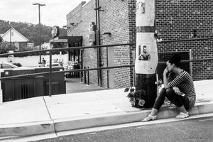 A young woman sits pensively on the curb, her striped shirt contrasting against the stark, monochrome tones of the photograph. The lighting casts soft shadows, enhancing the mood of contemplation as she gazes at a memorial on a nearby pole adorned with flowers and photographs. The urban backdrop, with its textured brick wall and distant hills, frames her solitude, emphasizing the weight of her thoughts.