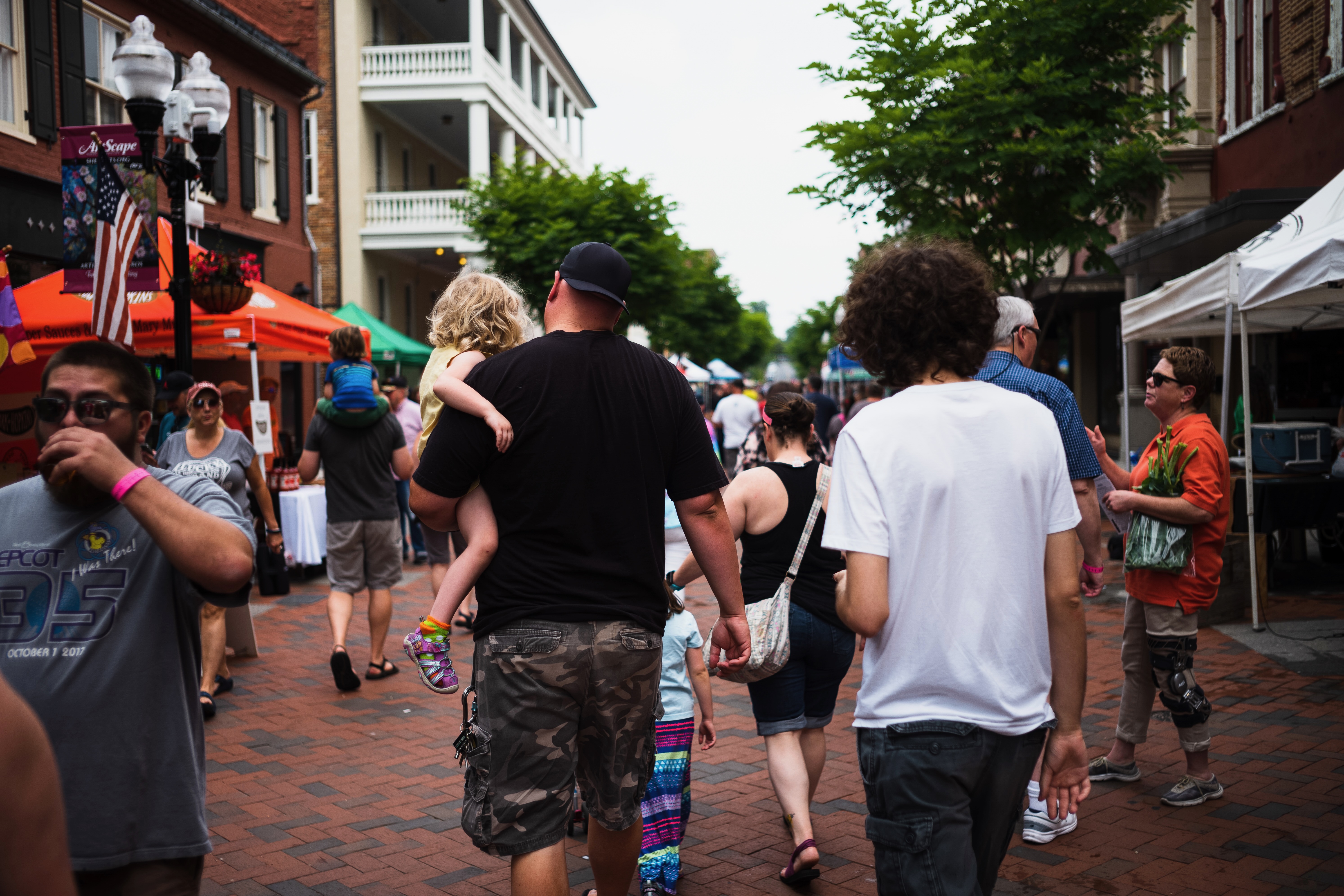 A bustling street fair captures the vibrant energy of a community gathering. In the foreground, a father carries his child, a moment of tenderness amidst the lively crowd that meanders through colorful stalls. The overcast sky casts a soft light, enhancing the relaxed yet jovial atmosphere of the scene.