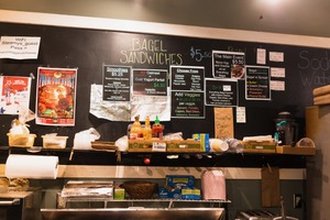 The photograph captures a rustic café setting dominated by a chalkboard menu displaying an eclectic range of bagel sandwiches and drinks. Warm, soft lighting creates an inviting atmosphere, while a cluttered shelf below hints at a bustling kitchen environment. The casual decor, with colorful posters and various condiments, suggests a laid-back, friendly vibe perfect for a quick bite.