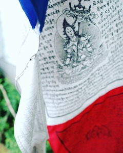 This photograph captures a close-up of traditional Tibetan prayer flags, intricately printed with sacred text and imagery of deities. The composition is softened by natural light, which enhances the vibrant colors, especially the rich reds and blues, evoking a sense of tranquility and reverence. The gentle fluttering of the fabric suggests a connection to the spiritual and the wind, embodying a moment of reflection.