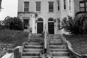 This photograph captures a symmetrical facade of a brick building, flanked by overgrown greenery. The stark black and white treatment emphasizes the textures of the weathered stairs and the quiet, almost nostalgic mood of the scene. Soft, diffused light highlights the details, inviting contemplation of forgotten stories within the structure.