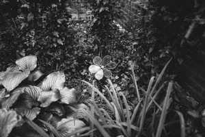 In this monochromatic garden scene, a solitary metal flower stands out against lush, textured foliage, creating a striking contrast. The composition draws the eye with its layered depth, showcasing both vibrant life and the stillness of the surrounding greenery. Soft, diffused lighting enhances the tranquil mood, inviting reflection on the beauty of simplicity and solitude.