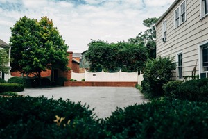 This photograph captures a tranquil courtyard framed by vibrant greenery and rustic architecture. The soft, diffused light enhances the peaceful atmosphere, while the low angle of the shot invites the viewer’s gaze into the inviting space. A white picket fence and lush foliage create a harmonious balance between structure and nature, evoking a sense of calm and serenity.