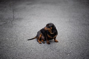 A solitary dog sits on an empty asphalt road, exuding a sense of calm and introspection. The soft diffused lighting highlights its sleek black and tan coat, casting gentle shadows that enhance the mood of quiet solitude. The composition, with the dog positioned off-center, invites the viewer to ponder its thoughts against the stark backdrop of the gray pavement.