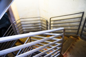 This photograph captures the winding descent of a stairwell, framed by sleek metallic railings that guide the viewer's eye downward. The cool, muted lighting creates a contrasting mood of solitude and contemplation, while the textured surfaces hint at wear and history. The composition invites one to ponder the spaces hidden below, evoking a sense of mystery and exploration.