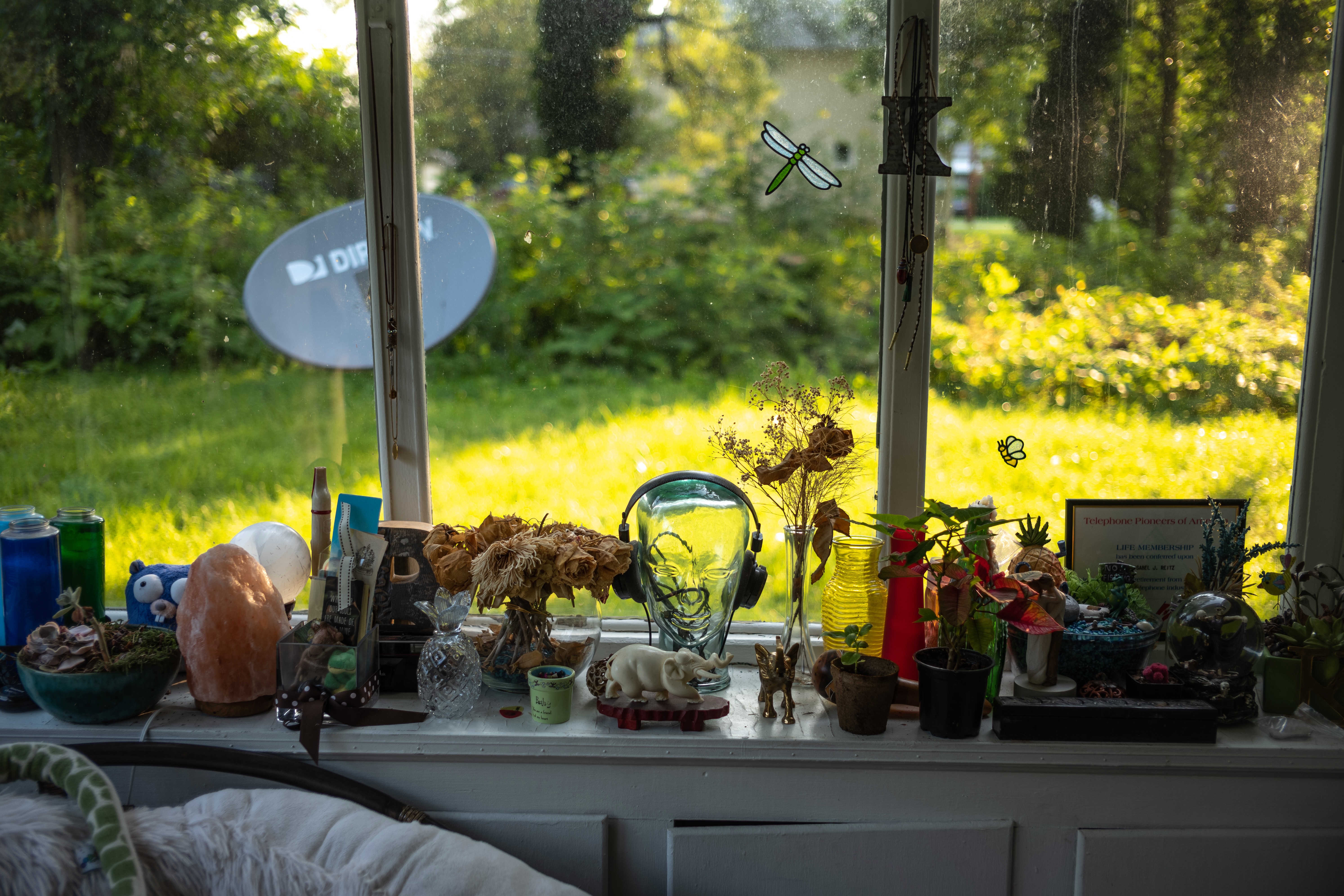 This photograph captures a sunlit window sill brimming with eclectic decorations and plants, illuminated by soft, warm light. The juxtaposition of dried flowers and vibrant glassware suggests a harmony between decay and renewal, creating a reflective, tranquil mood. Outside, a lush green landscape serves as a vibrant backdrop, connecting the indoor clutter to nature's beauty.