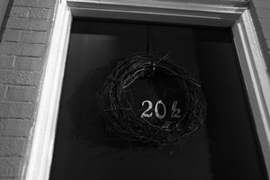 A close-up of a dark door features a simple wreath hanging above the house number '20 ½'. The monochrome palette imbues the scene with a sense of nostalgia and quiet intrigue, inviting viewers to ponder the stories beyond the threshold. Soft shadows and subtle textures enhance the composition, fostering a mood of warmth and mystery.