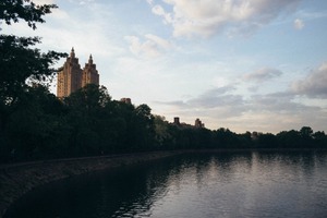 The photograph captures a tranquil moment where towering buildings emerge softly from the greenery, reflecting their silhouettes in a calm, glistening body of water. The muted tones of the sky hint at the approach of twilight, evoking a sense of peaceful solitude. The composition skillfully balances nature and urban architecture, creating a harmonious blend of elements.